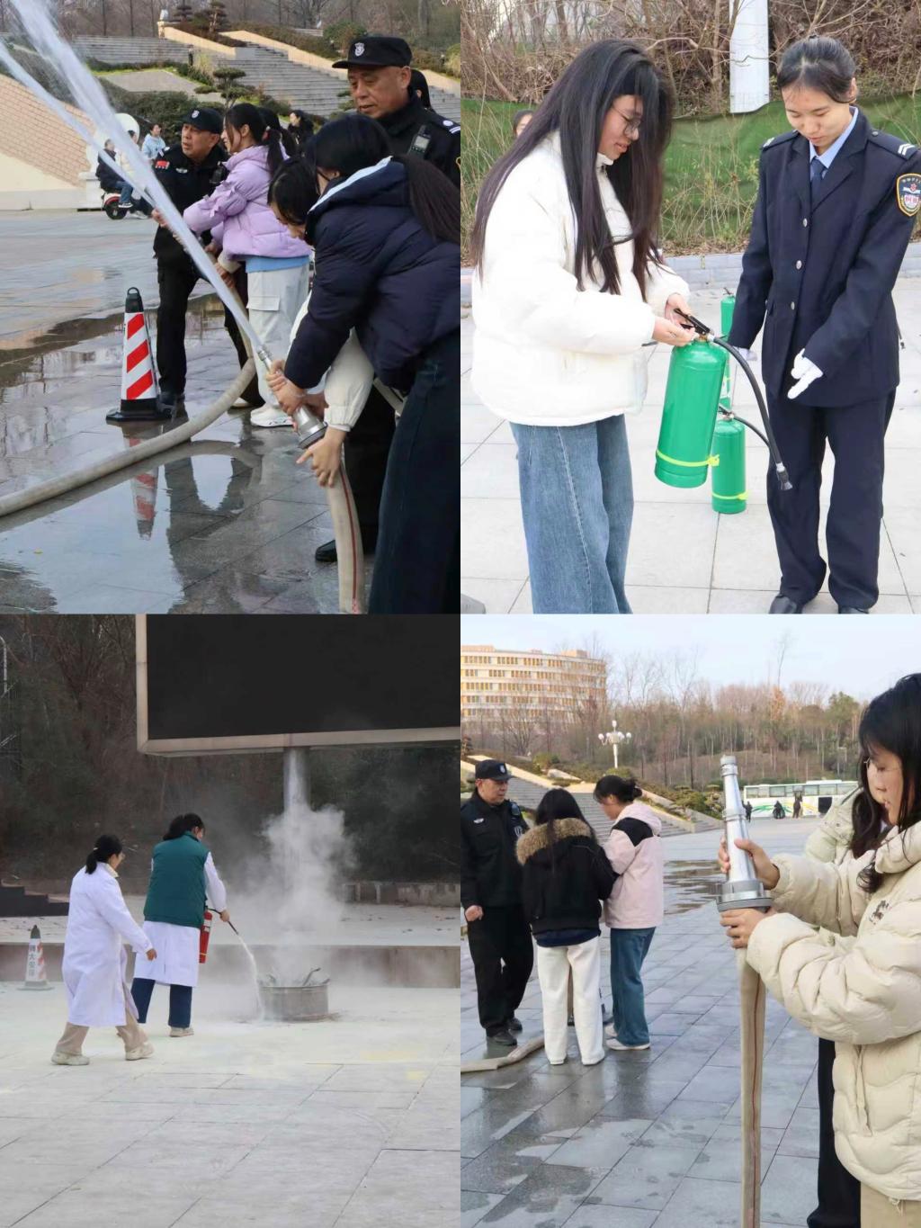 培训现场,保卫处贾红光老师首先结合高校消防特点,系统讲解了灭火器、消火栓、防火面具等常见消防器材的结构原理、适用场景及操作要点。在消火栓演示环节,培训人员逐步示范水带展开、接口连接、阀门启闭的全流程,分解动作要领;讲解灭火器时,则紧扣“提、拔、握、压”四字口诀,配合现场演示,帮助师生直观掌握使用规范。在实操演练阶段,师生分组参与体验。教职工带头进行灭火器模拟灭火,员工则在专业人员指导下,依次练习消防水带连接、水枪操作、防火面具佩戴等项目。现场设置了模拟火盆灭火、消防水带出水等实战环节,师生从初次尝试的紧张生疏到逐步熟练,在实践中切实巩固了操作技能与应急反应能力。